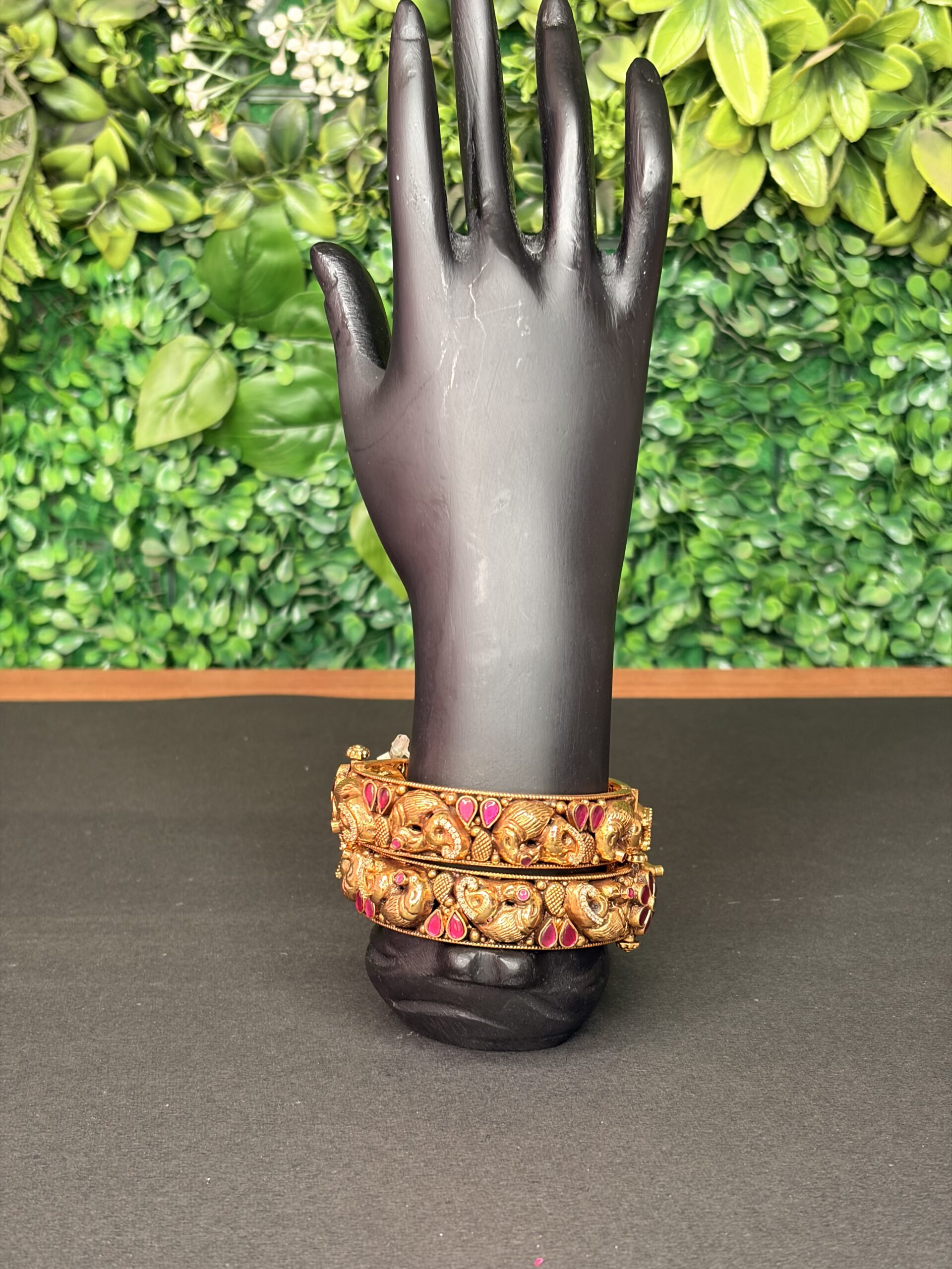 These magnificent temple-style bangles are a true celebration of traditional craftsmanship and regal design. Crafted in a rich antique gold finish, the bangles feature a continuous row of intricately carved elephant motifs, symbolizing strength, wisdom, and prosperity. Each elephant is beautifully detailed, creating a striking and cohesive pattern that wraps elegantly around the wrist.