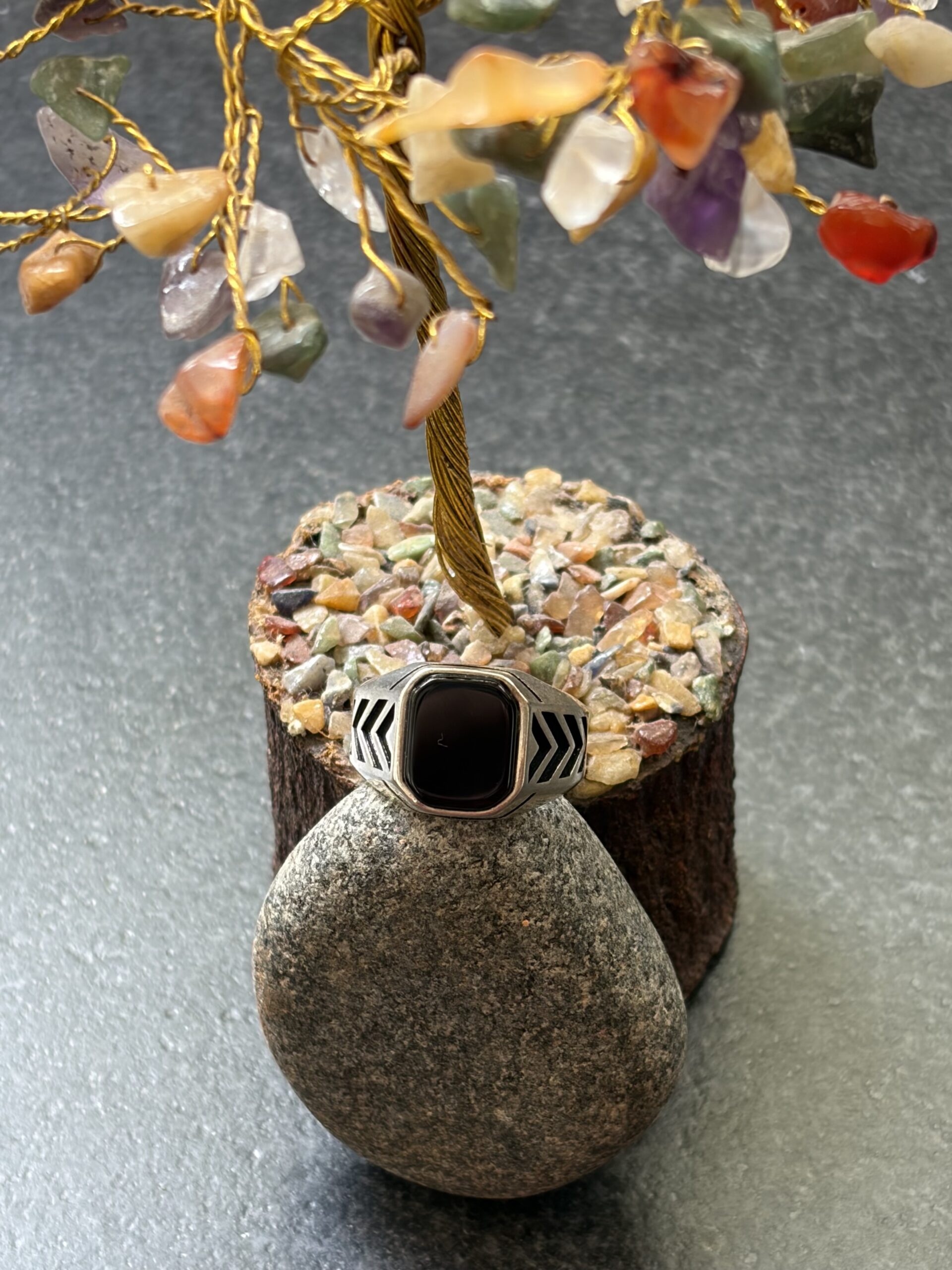 This striking finger ring features a bold, square-shaped centerpiece set with a glossy black stone that exudes depth and sophistication. The stone is framed in a sleek silver-toned bezel, enhancing its sharp, modern appeal. The band is wide and structured, adorned with engraved chevron-style cutouts on both sides that add a dynamic, geometric flair. Its solid construction and clean lines give it a strong, masculine aesthetic, making it a standout accessory for contemporary styling. Perfect for those who prefer minimal yet impactful jewelry, this ring blends classic signet inspiration with modern design elements.