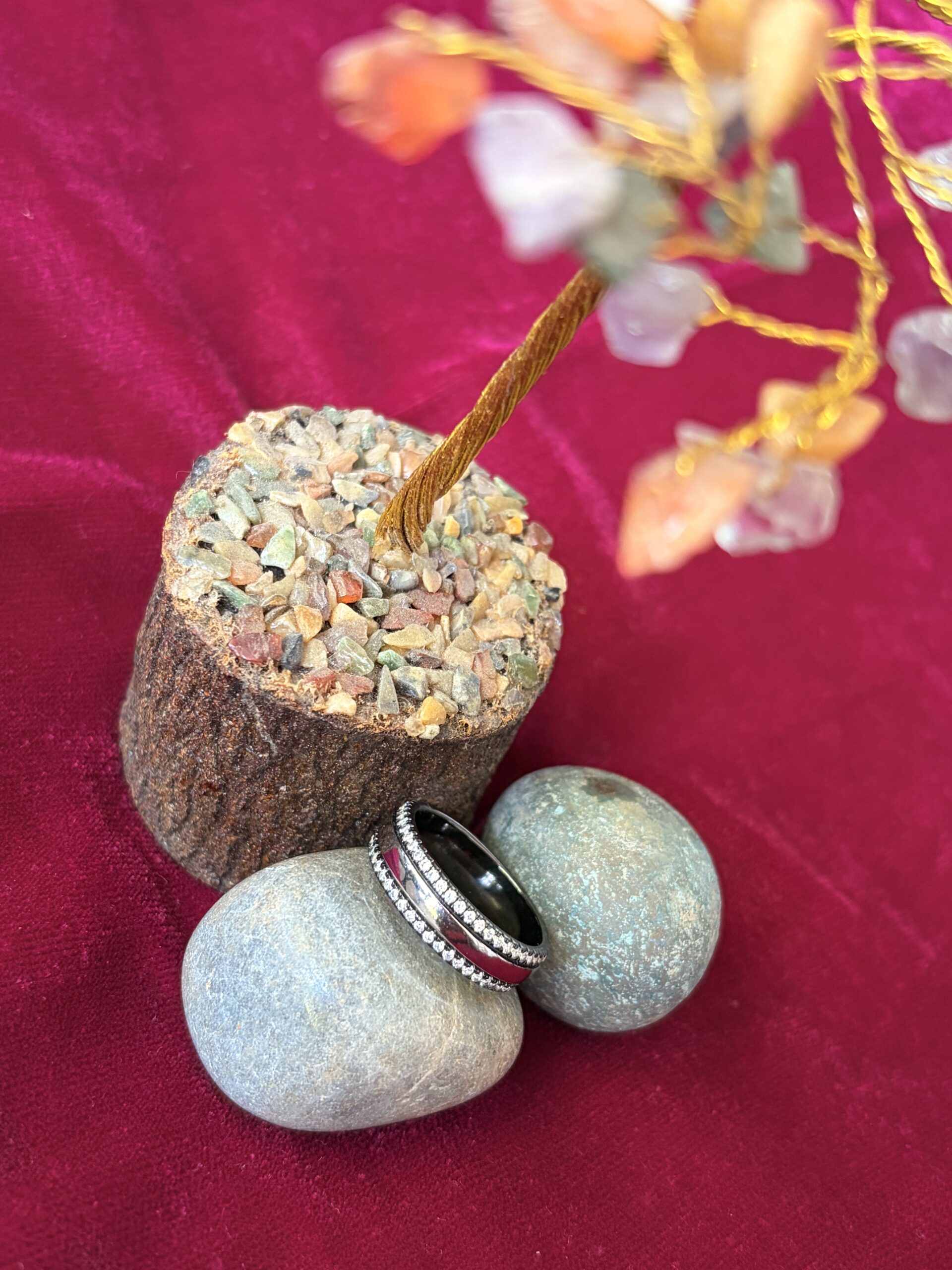 This modern ring features a sleek and stylish design, combining bold contrast with refined detailing. The band showcases a striking colored inlay at its center, adding a vibrant touch that stands out against the darker inner tone. Flanking the inlay are delicate rows of pave-set micro stones, offering a subtle yet captivating sparkle. The outer edges are finely textured, enhancing the ring’s overall depth and visual interest. With its smooth inner finish and balanced structure, this ring delivers both comfort and contemporary elegance—perfect for everyday wear or as a unique statement piece.