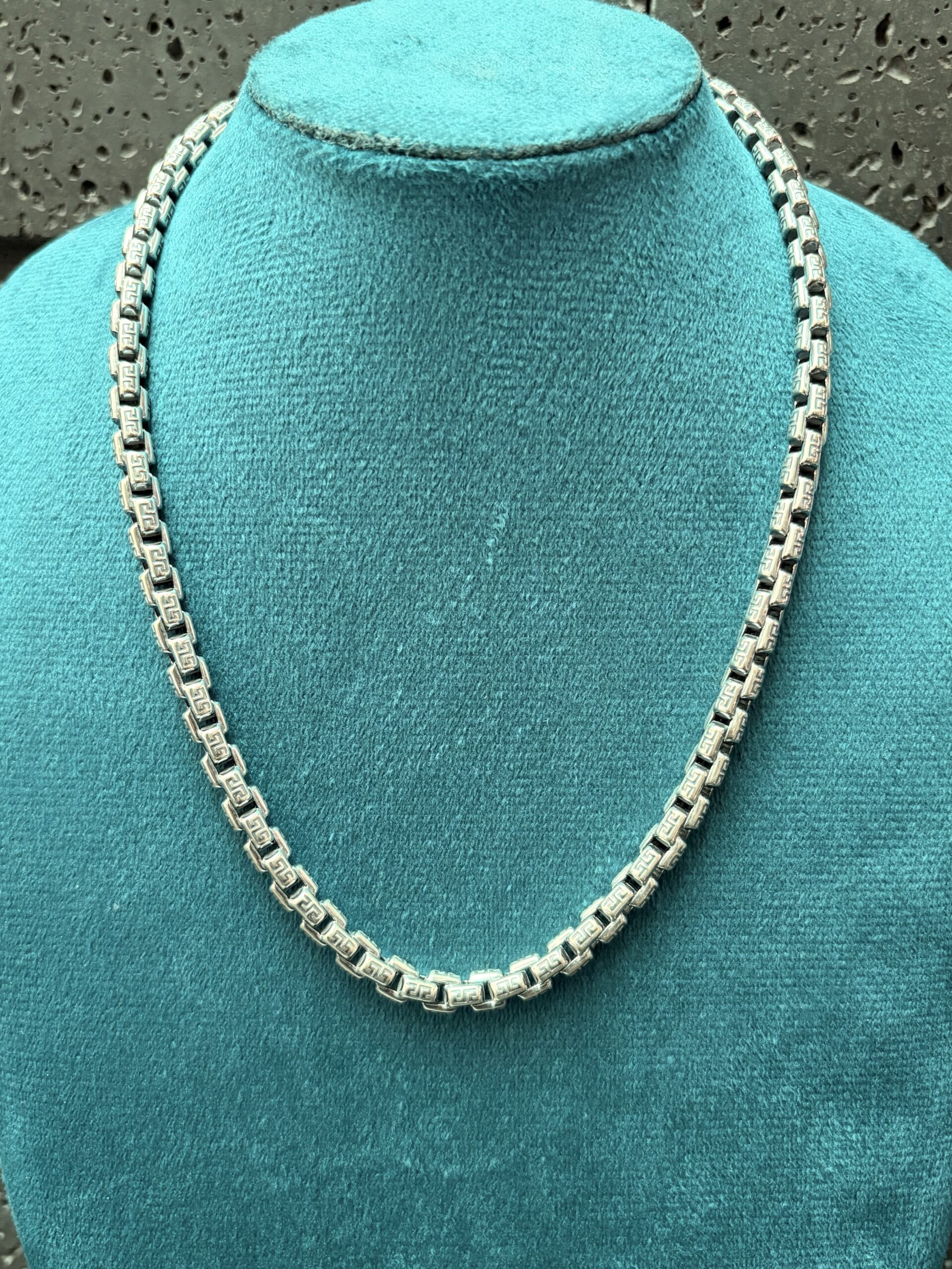 • Design: Square link chain with Greek key (meander) pattern