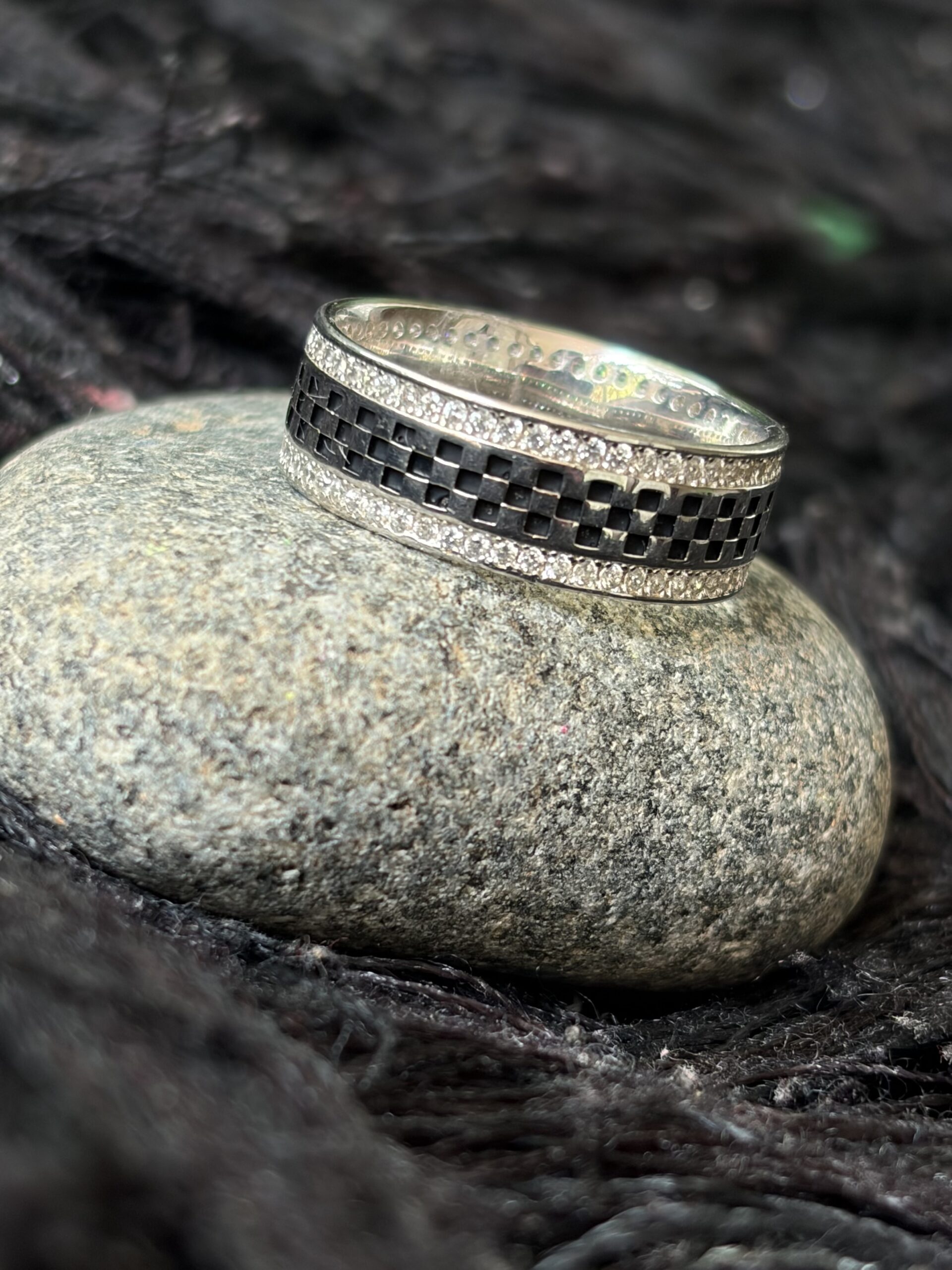 This sophisticated finger ring features a wide-band design highlighted by a striking checkerboard pattern in a dark oxidized finish. The central band showcases interlocking square motifs that create depth and texture, while both edges are adorned with rows of pavé-set stones that add brilliance and contrast. The combination of bold geometric detailing and sparkling accents gives the ring a modern, high-end appeal. Perfectly crafted for those who appreciate statement pieces with refined elegance, this ring seamlessly blends structure with shine.
