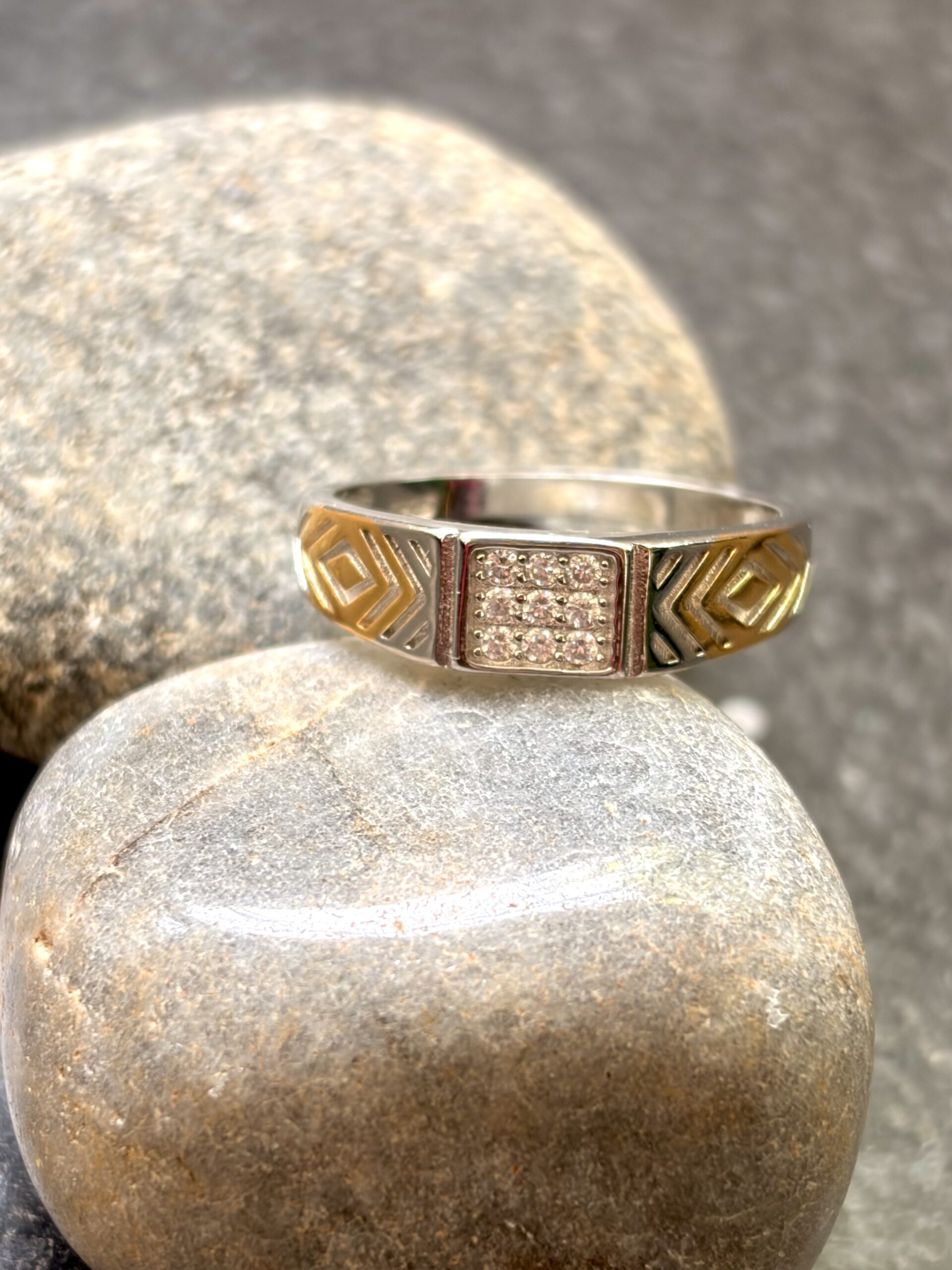 This stylish ring showcases a bold fusion of modern design and classic detailing. At the center lies a square panel adorned with closely set micro stones, creating a brilliant pave effect that catches the light beautifully. Flanking the centerpiece are intricate geometric patterns inspired by angular motifs, highlighted in a striking dual-tone finish with gold accents contrasting against a polished silver base. The structured band offers a balanced and contemporary look, while the subtle oxidized detailing enhances depth and definition. Perfect for those who appreciate distinctive design, this ring makes a refined yet eye-catching statement.