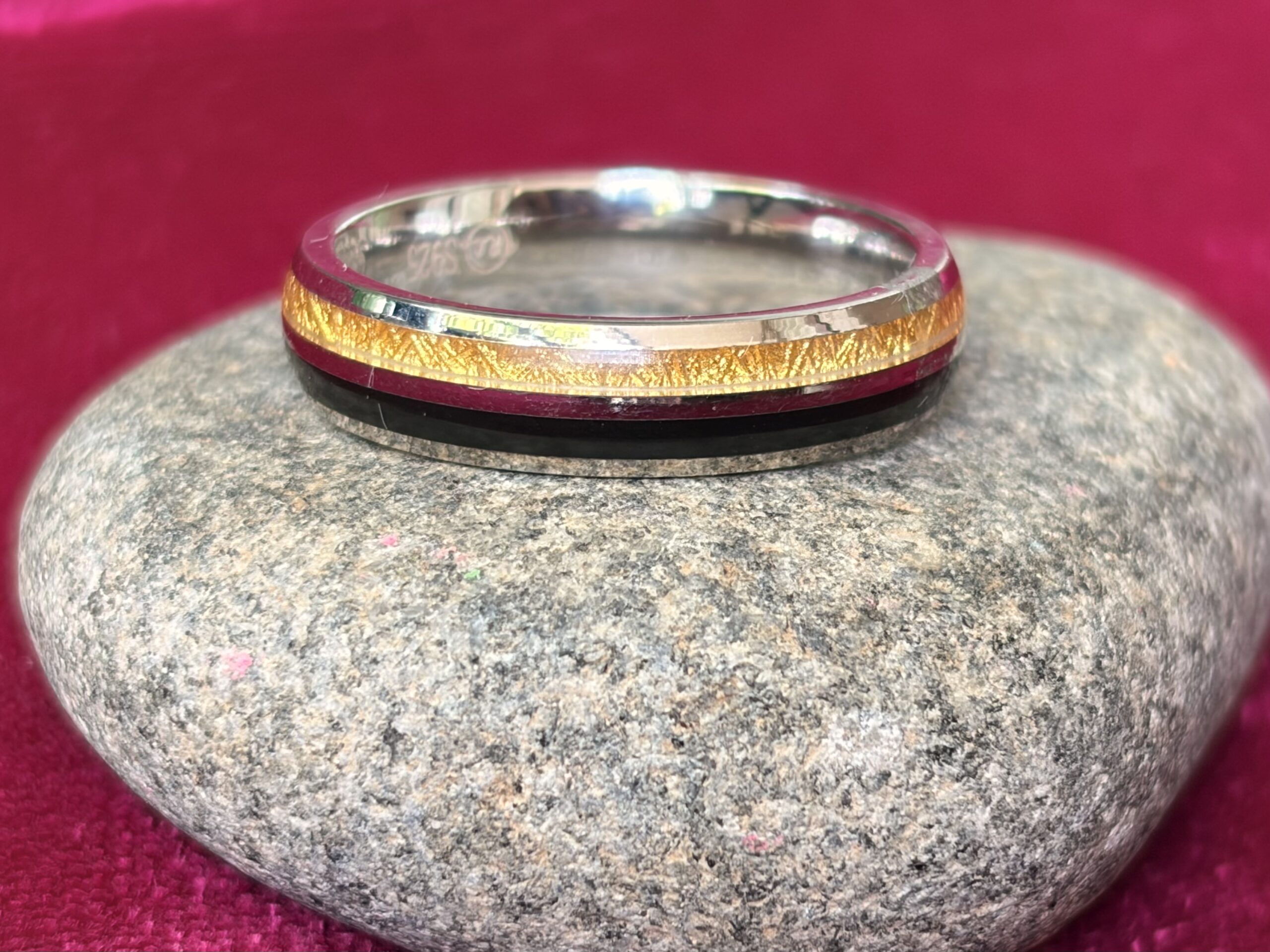 This sophisticated band ring features a refined dual-tone design that effortlessly blends classic elegance with modern style. At its center runs a textured gold-toned inlay, adding warmth and a subtle shimmer to the piece. This is beautifully framed by polished silver-toned edges that enhance its sleek and contemporary appeal. A contrasting dark accent line beneath the gold layer adds depth and definition, creating a striking layered effect. With its slim profile and smooth inner finish, this ring offers both comfort and versatility—perfect for everyday wear or as a timeless accessory for special occasions.