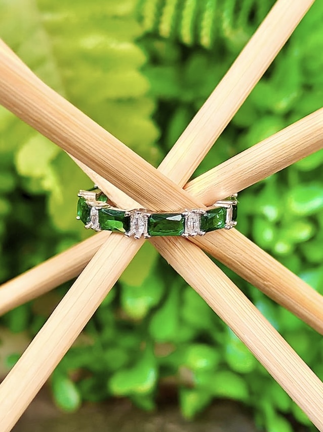 This stunning ring showcases a refined and luxurious design, centered around a row of vivid emerald-cut green gemstones that exude richness and elegance. Each green stone is beautifully set in a linear arrangement, creating a continuous band of color that captures attention. Between the green stones are sparkling clear accent stones, adding brilliance and enhancing the overall radiance of the ring. Crafted in a polished silver-tone setting, the design highlights the contrast between the deep green hues and the shimmering accents. The sleek, structured band ensures a comfortable fit while maintaining a sophisticated, timeless appeal—perfect for both everyday elegance and special occasions.