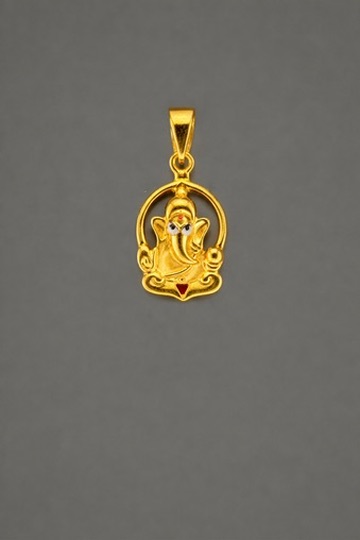 A beautifully designed gold polished pendant featuring Lord Ganesha seated gracefully within a circular halo frame. The pendant showcases a serene expression, finely shaped trunk, and symbolic posture representing wisdom, prosperity, and the removal of obstacles. Subtle enamel detailing highlights the eyes and tilak, adding charm and character to the radiant gold finish. The minimal yet divine design makes it perfect for both daily wear and special occasions.