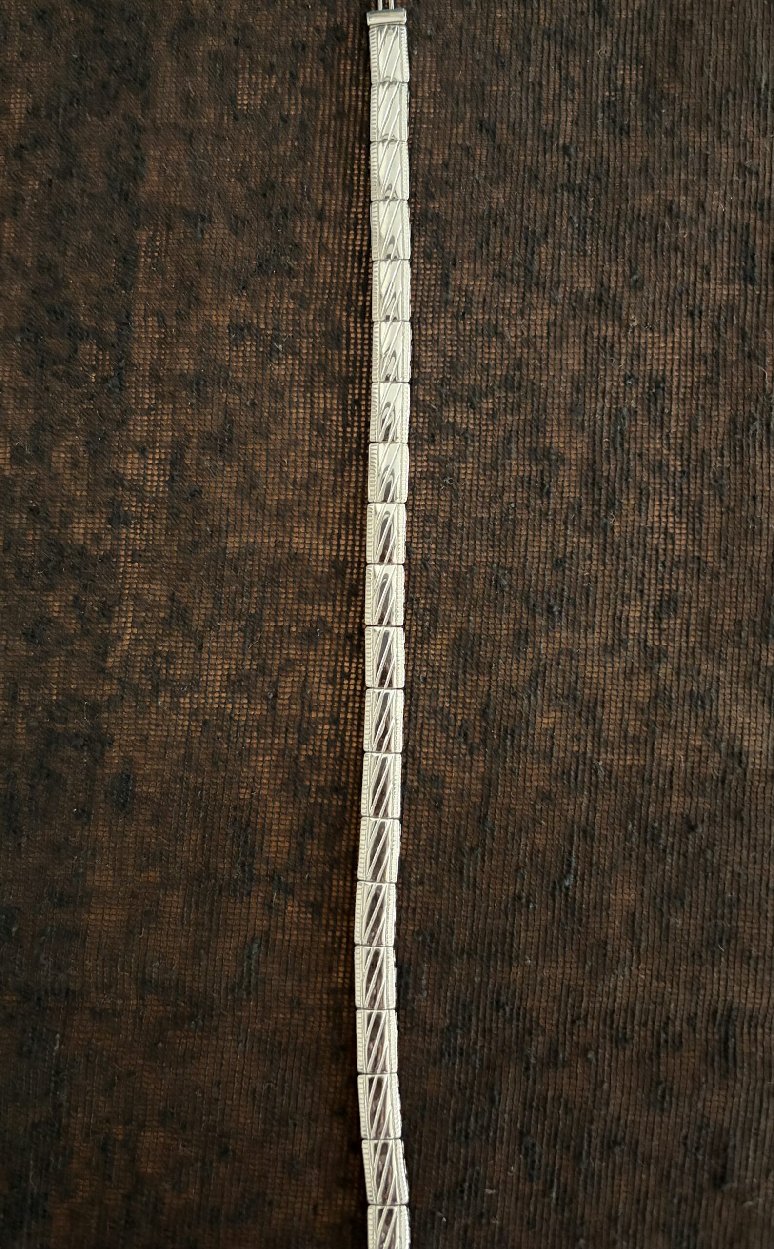 This sleek silver bracelet features a structured design composed of evenly spaced rectangular links arranged in a continuous line. Each link is engraved with diagonal and linear textured patterns, creating a refined geometric appearance. The uniform layout gives the bracelet a clean, modern look, while the subtle detailing adds depth and character. Its streamlined silhouette makes it both elegant and versatile for everyday or formal wear.