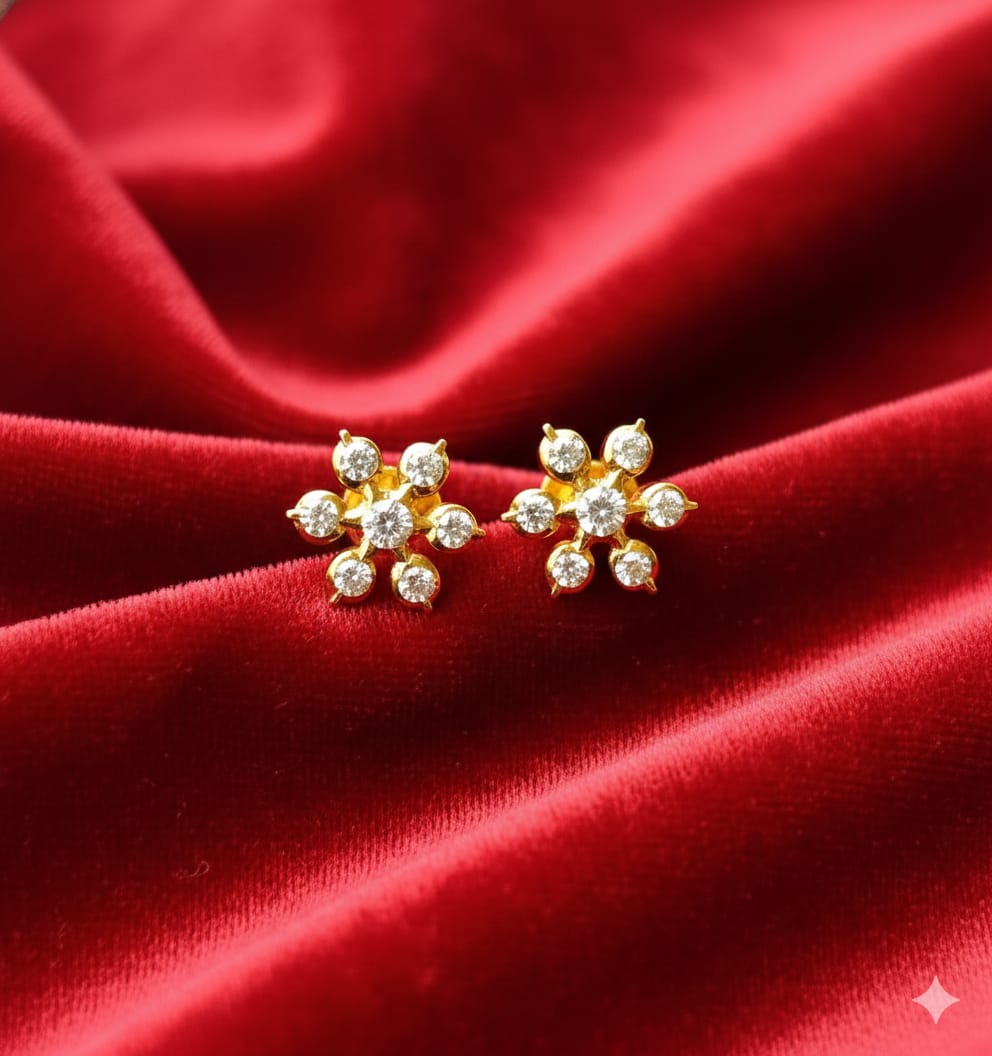These elegant gold stud earrings feature a charming floral-inspired design centered around a brilliant round stone. Surrounding the center are evenly spaced sparkling stones arranged like delicate petals, forming a radiant flower pattern. The polished gold setting enhances the brilliance of each stone while adding warmth and richness to the overall look. Compact yet eye-catching, these earrings offer a timeless appeal, making them perfect for everyday elegance as well as festive occasions.