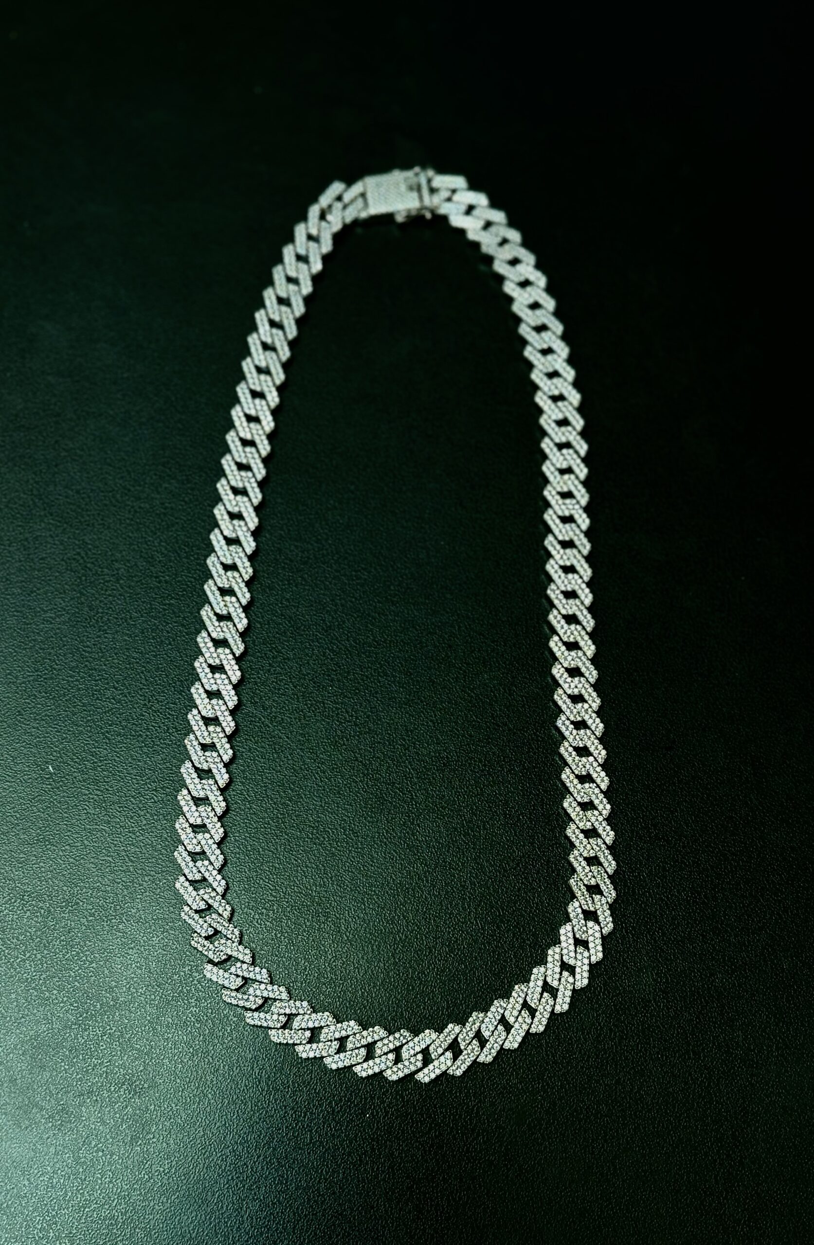 Each interlocking link is encrusted with closely set shimmering stones, creating a continuous surface of brilliance that reflects light from every angle. The dense, uniform pattern gives the chain a powerful and premium aesthetic, making it a standout accessory. Its broad structure and high-polish finish add to its bold presence, while the secure clasp ensures durability and ease of wear.