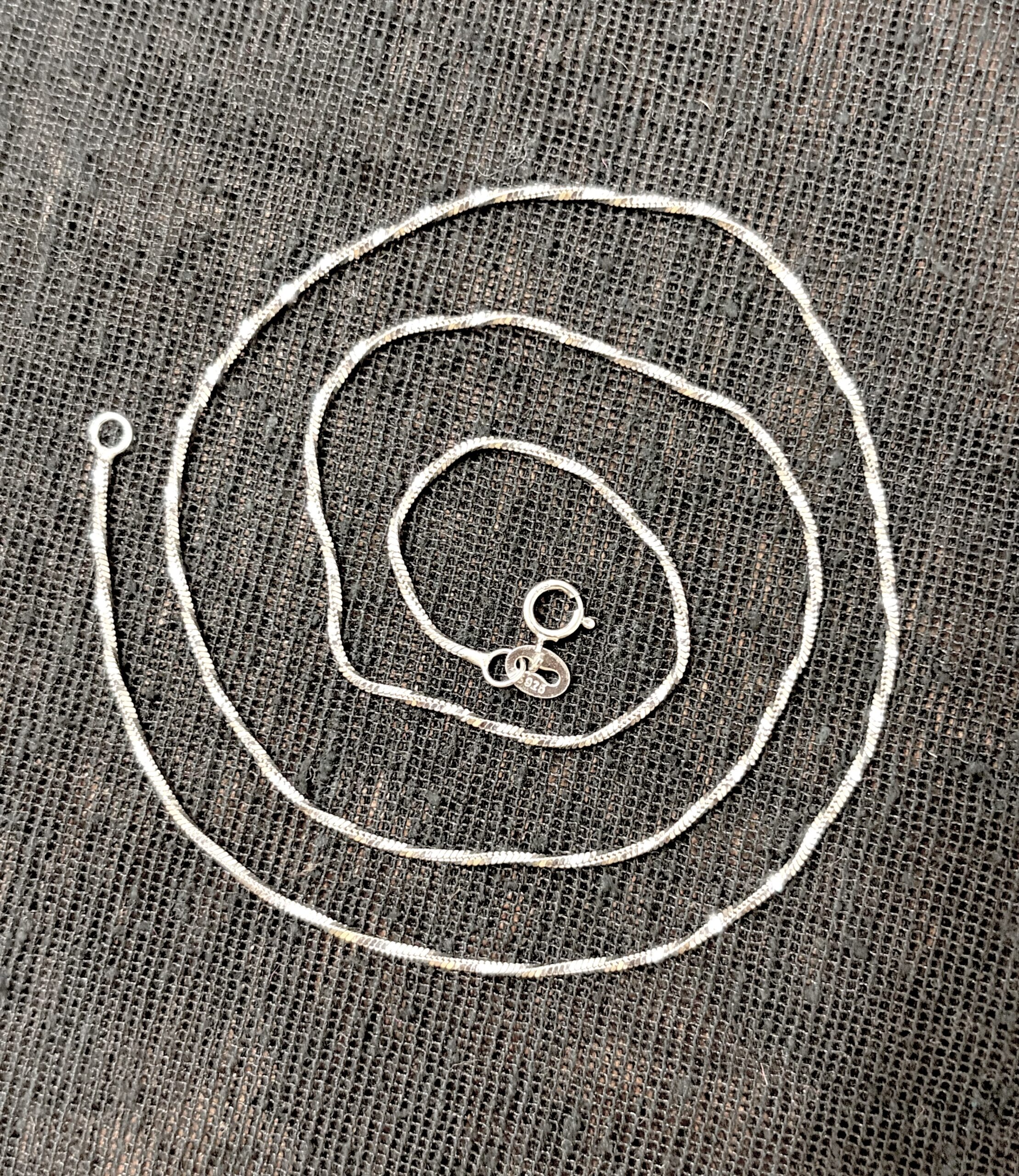 This refined silver-toned Italian chain showcases a sleek and minimalist design enhanced with subtle accent detailing along its length. Crafted with fine, closely linked segments, the chain features evenly spaced bead-like highlights that add delicate texture and a gentle shimmer. Its smooth, flexible structure allows it to drape beautifully around the neckline, making it a versatile piece for both everyday styling and layered looks. The polished silver finish lends a timeless appeal suitable for any occasion.