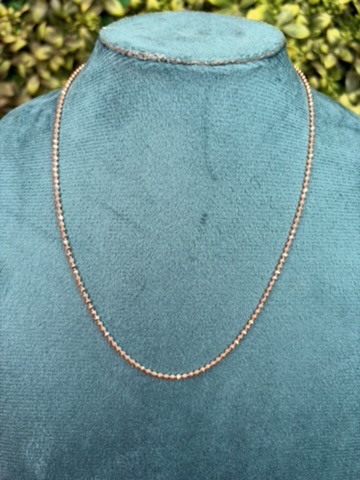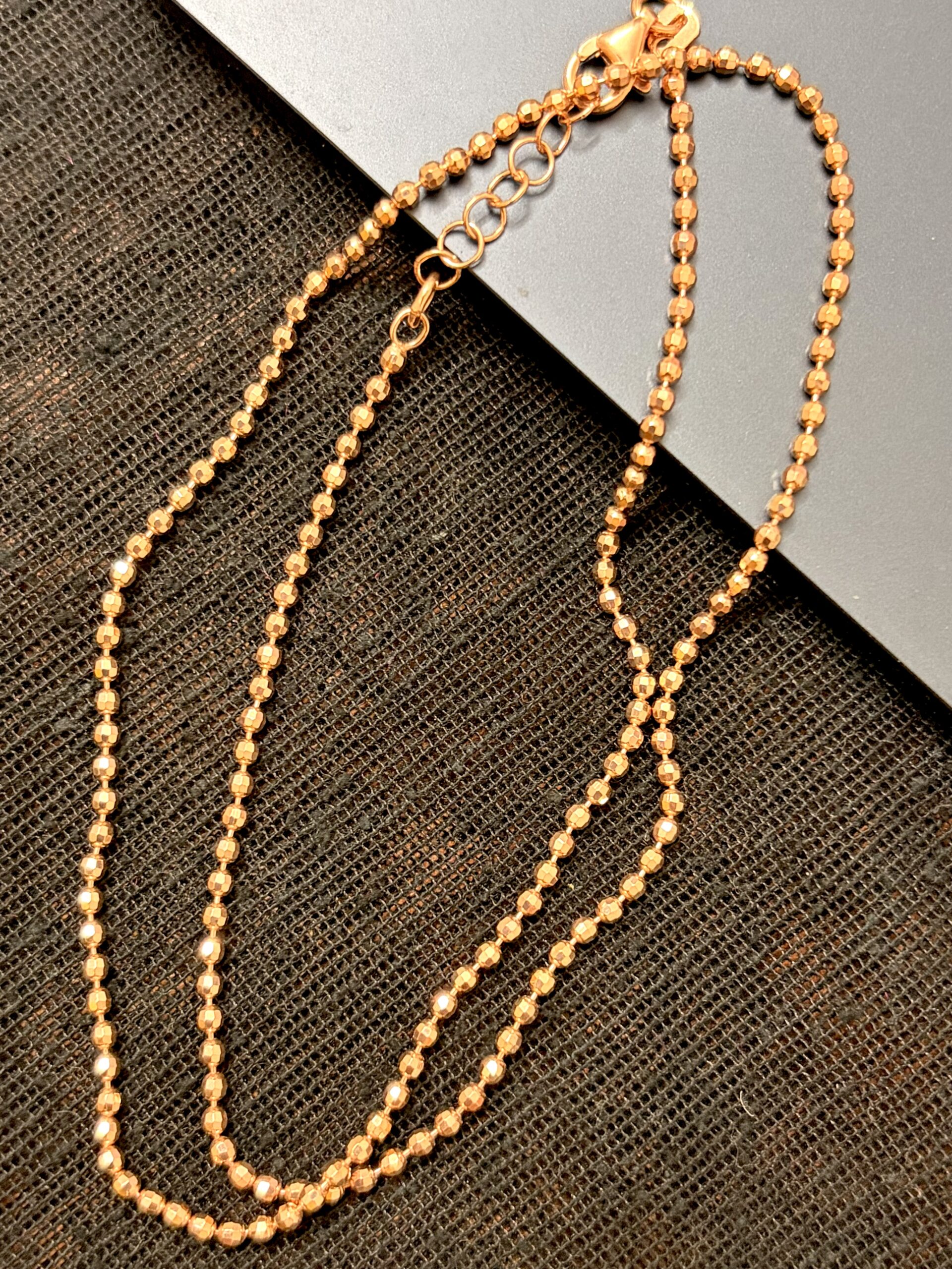 This elegant Italian chain features a refined sequence of uniformly sized polished Rose gold beads, creating a smooth and radiant finish. The precision-cut spherical beads reflect light beautifully, offering a subtle yet eye-catching shimmer. Crafted with a sleek and minimal design, this chain embodies timeless European sophistication and everyday versatility.