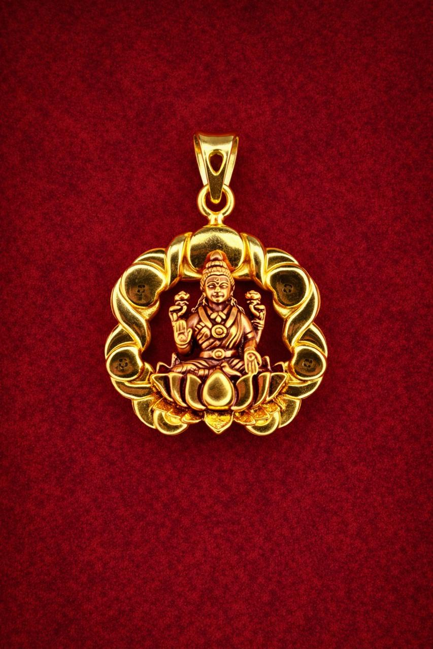 A beautifully crafted gold polished pendant featuring Goddess Lakshmi seated gracefully on a blooming lotus. The deity is enclosed within an ornate circular halo design, symbolizing prosperity, purity, and divine blessings. The intricate detailing and radiant gold finish enhance its spiritual elegance, making it a meaningful and timeless piece.