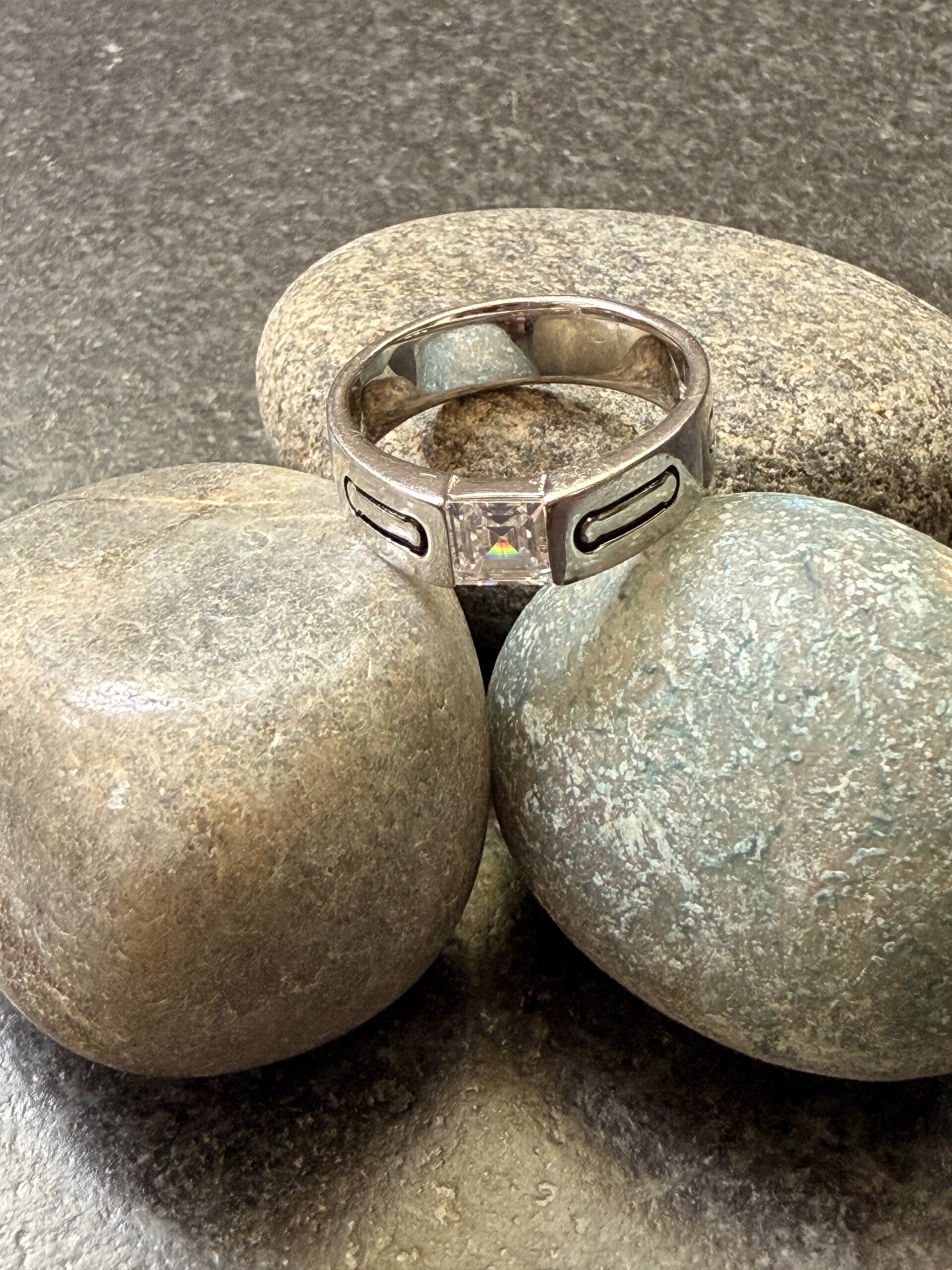 This refined ring embodies minimalist sophistication with a modern edge. At its center is a sparkling square-cut gemstone, neatly set within a clean, structured mount that enhances its brilliance without overwhelming the design. The band features smooth contours complemented by subtle elongated groove accents on either side, adding a touch of contemporary detail. Finished in a polished silver tone, the ring offers a balanced blend of simplicity and style. Its streamlined profile ensures a comfortable fit, making it an ideal choice for everyday elegance or understated statement wear.
