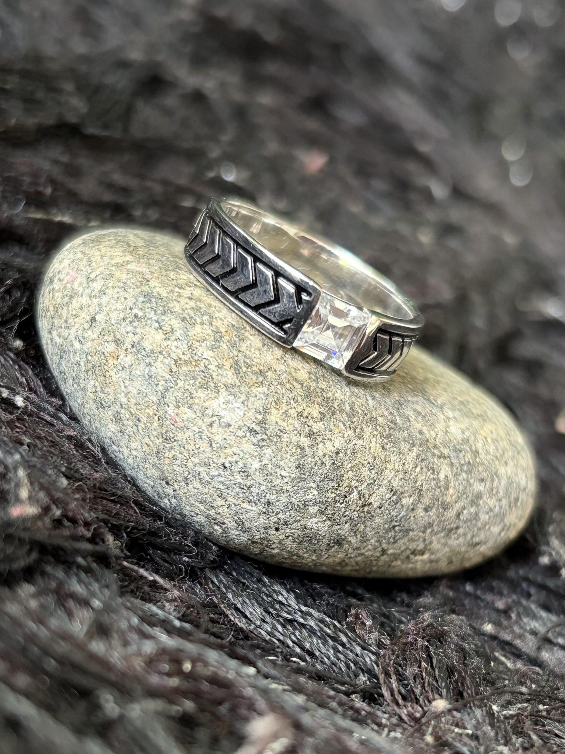 This striking ring showcases a bold and contemporary design, blending rugged character with refined elegance. At its center sits a clear, emerald-cut gemstone that reflects light with crisp brilliance, adding a sophisticated focal point. The band features a distinctive chevron (arrow-like) engraved pattern in a darker oxidized finish, creating a strong contrast against the polished silver-toned metal. The geometric detailing gives the ring a masculine, architectural appeal, while the smooth inner band ensures comfortable wear. Set against a natural stone backdrop, the piece exudes a raw, earthy charm paired with modern craftsmanship.
