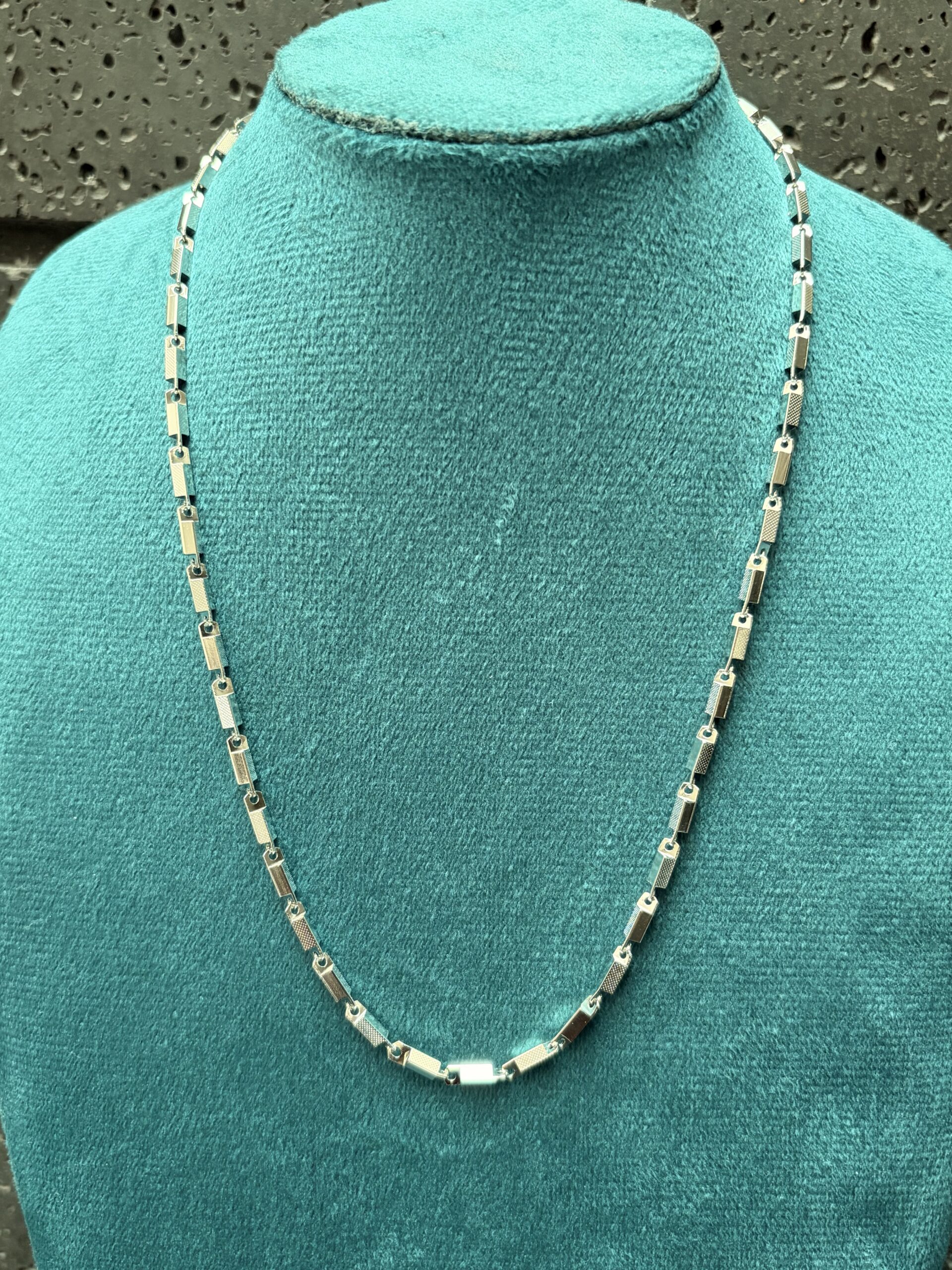 The clean geometric pattern gives the chain a modern, minimalist aesthetic, making it ideal for both casual wear and formal occasions. Its lightweight yet sturdy construction allows it to sit comfortably around the neckline, while the subtle shine of the metal enhances its sophisticated charm.