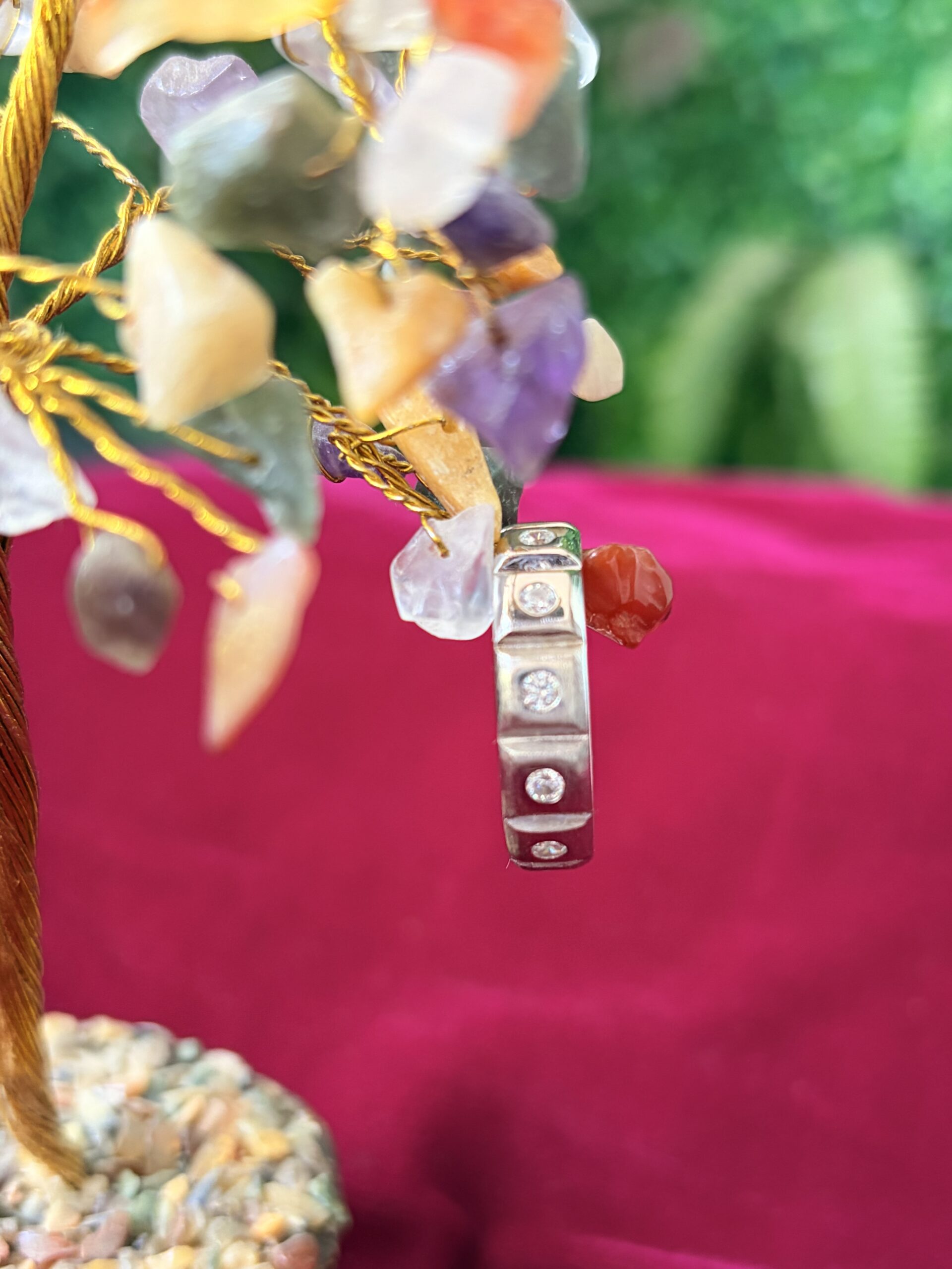 This sleek and contemporary ring features a distinctive studded design that blends minimalism with subtle brilliance. The band is crafted with evenly spaced circular settings, each housing a flush-set stone that sits smoothly within the metal surface. This design not only enhances durability but also creates a clean, streamlined look. The polished silver-tone finish adds a refined shine, while the structured pattern gives the ring a modern, industrial-inspired edge. Comfortable and versatile, this piece is perfect for everyday wear or as a stylish stacking ring.