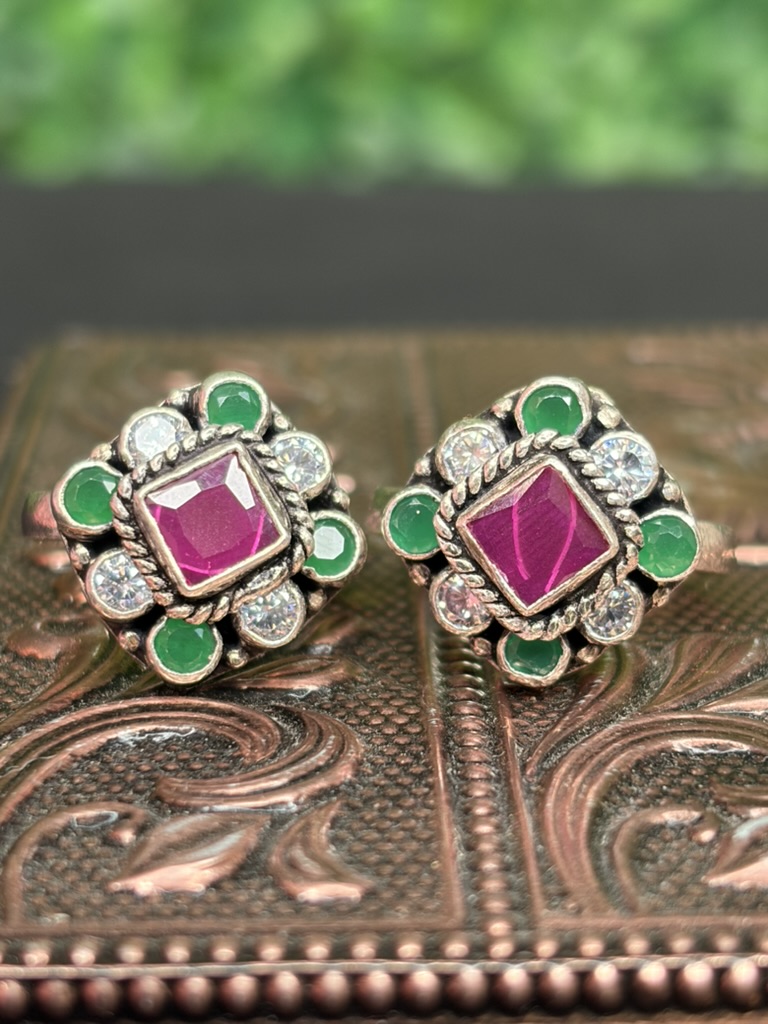 A vibrant pair of toering designed with rich colours and intricate detailing. At the center sits a bold square-cut magenta stone, beautifully framed with delicate rope-style metalwork. Surrounding the centerpiece is a floral halo of alternating green and clear round stones, creating a striking contrast and a regal, festive look.