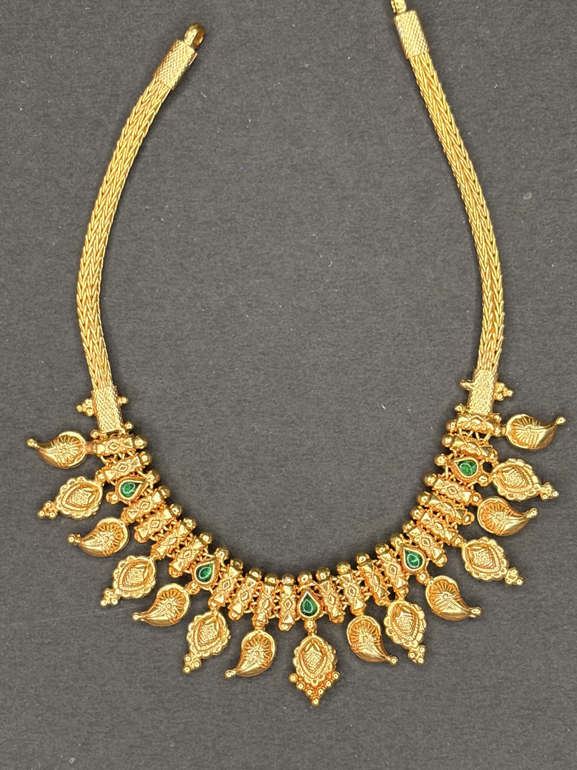 An elegant antique-finish temple necklace featuring a series of intricately carved mango (paisley) motifs gracefully arranged along the neckline. Accented with green stone highlights and detailed traditional patterns, the design exudes timeless South Indian charm.