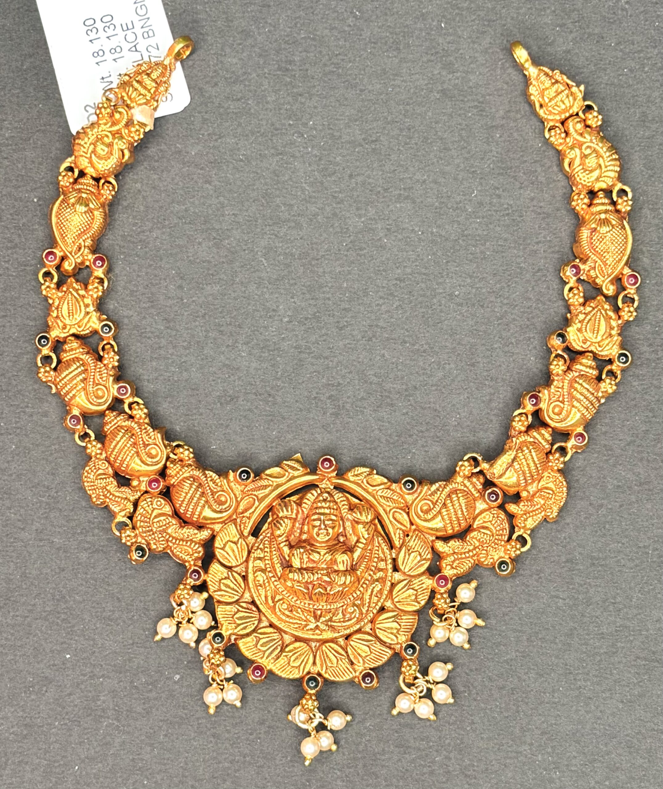 A magnificent antique-finish temple necklace featuring a grand circular Lakshmi medallion at the center, symbolizing wealth and divine blessings. The piece is adorned with intricately carved traditional motifs along the chain and finished with delicate pearl drops for a rich, heritage look.