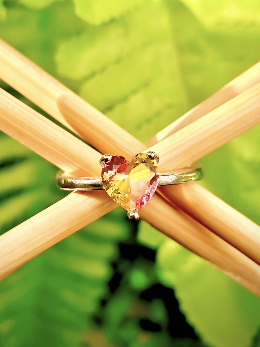 This charming ring features a captivating heart-shaped gemstone that radiates a beautiful blend of warm hues, transitioning gracefully between golden yellow, soft orange, and subtle pink tones. The vibrant multicolor effect gives the stone a lively, romantic appeal, making it the true focal point of the design. Secured with delicate prong settings, the gemstone catches and reflects light brilliantly from every angle. The slim, polished silver-tone band provides a clean and minimal backdrop, allowing the colorful centerpiece to shine. Elegant yet playful, this ring is perfect for expressing love, joy, and individuality.