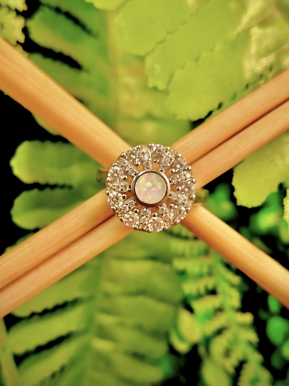 Graceful and luminous, this enchanting ring features a mesmerizing round opal centerpiece that glows with soft iridescent hues, reflecting flashes of green, gold, and subtle pink tones. Encircling the opal is a dazzling halo of finely set stones arranged in a sunburst pattern, creating the illusion of a blooming flower. The intricate setting enhances the brilliance of each stone while adding depth and dimension to the design. The slim, polished band keeps the focus on the radiant top, making this ring a perfect blend of elegance and charm—ideal for both everyday sophistication and special occasions.