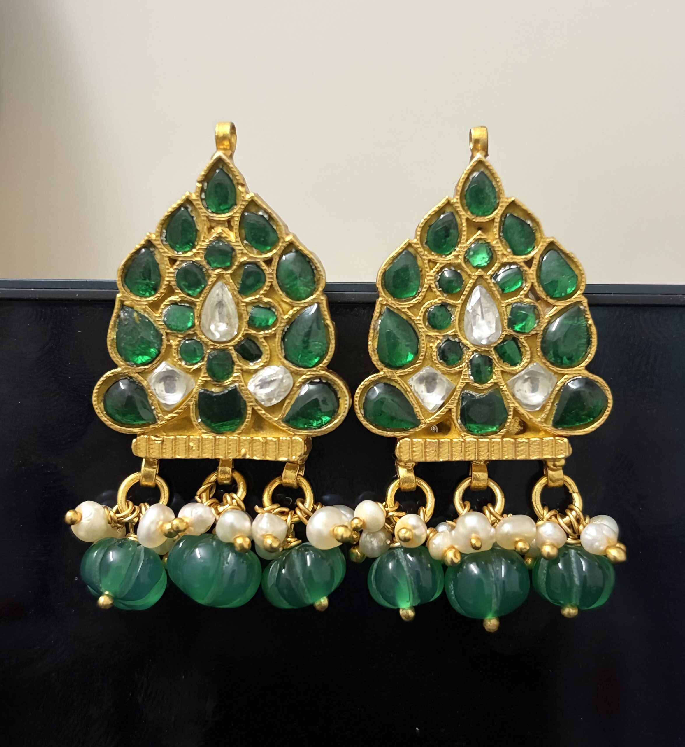 At the base, delicate pearl clusters and carved green bead drops create graceful movement, adding charm and elegance to the overall design. The combination of bold green hues, soft pearls, and warm gold tones makes these earrings perfect for festive occasions, weddings, and traditional celebrations.
