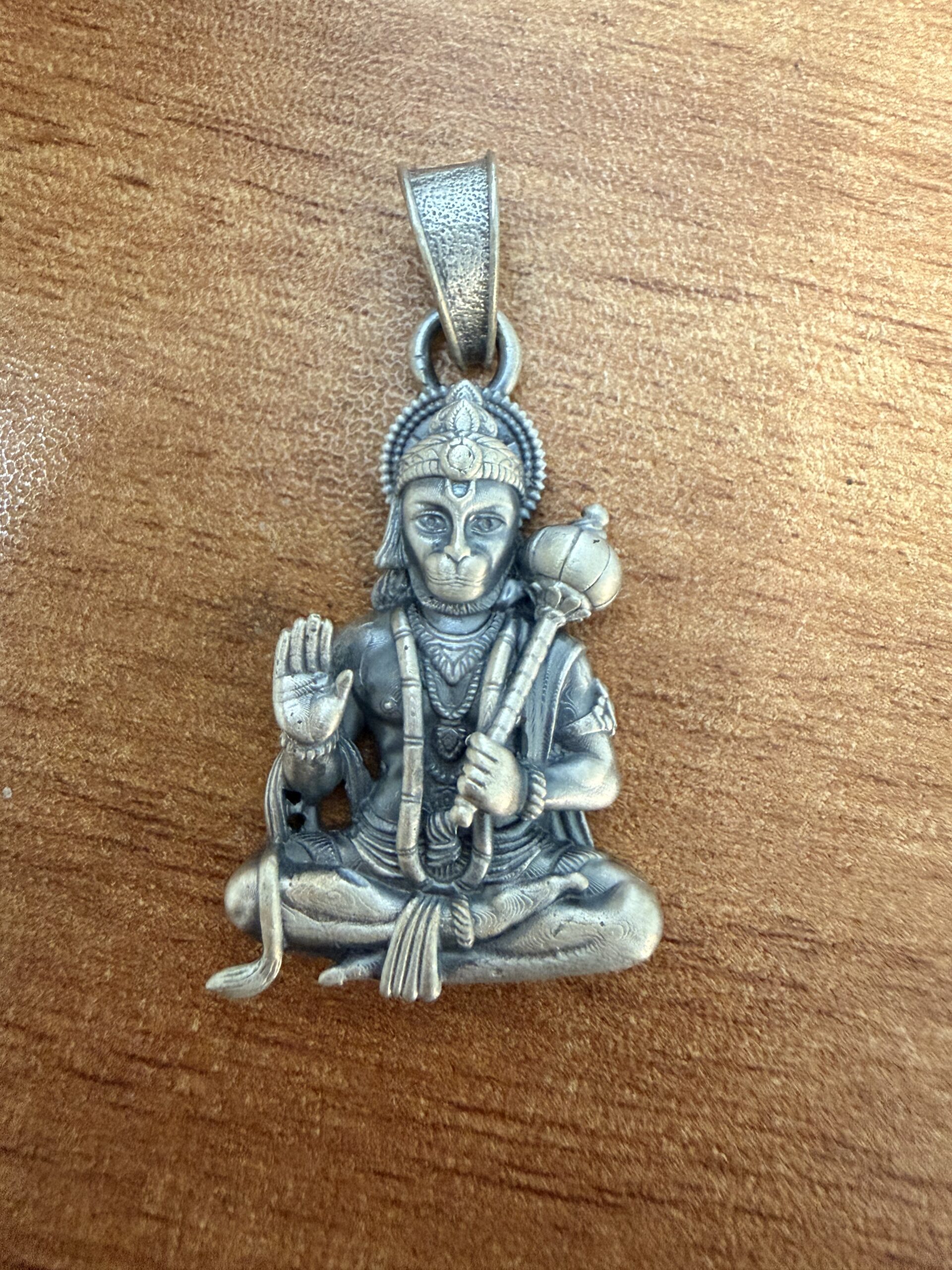 This finely crafted silver pendant features Lord Hanuman in a serene seated posture, symbolizing devotion, strength, and protection. Depicted sitting cross-legged, Hanuman holds his sacred mace (gada) resting on his shoulder, while his raised right hand is shown in the Abhaya Mudra, blessing and offering reassurance to devotees. The pendant showcases detailed facial features, an ornate crown, layered necklaces, and traditional attire with intricate carvings that enhance its divine presence. The matte-finish silver tone gives it a classic and spiritual appeal, making it suitable for daily devotional wear.