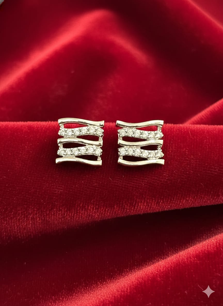 These sophisticated white gold polished stud earrings feature a modern criss-cross design that blends sleek metal lines with sparkling diamond accents. The layered wave-like bands create a dynamic, interwoven pattern, giving the earrings a contemporary and refined look. At the center, a row of shimmering diamonds is delicately set to enhance brilliance and contrast against the polished white gold finish. Compact yet eye-catching, these studs offer a perfect balance of elegance and minimalism, making them suitable for both everyday wear and special occasions.