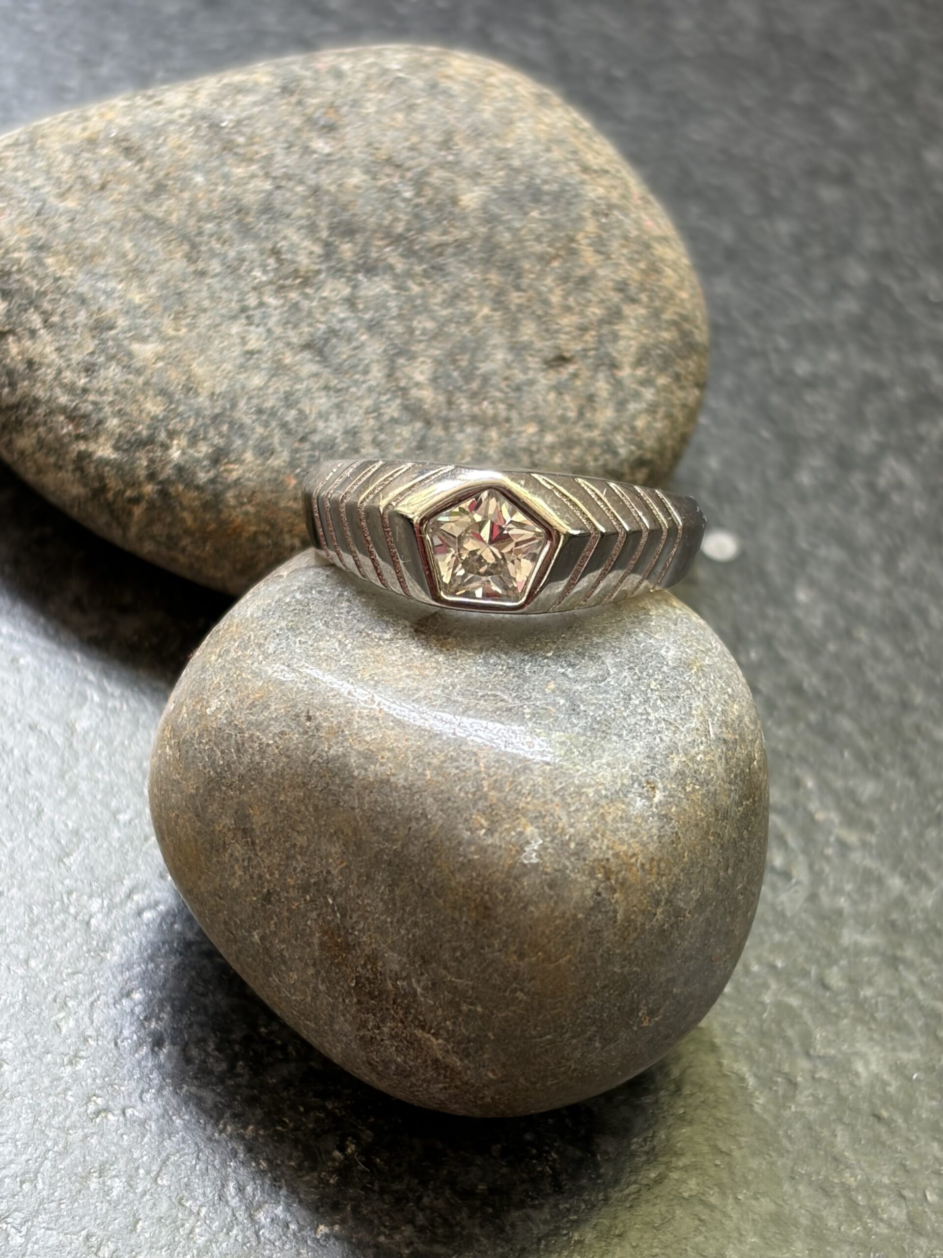 Textured Chevron Band Ring with Pentagon-Cut Stone (size 21)